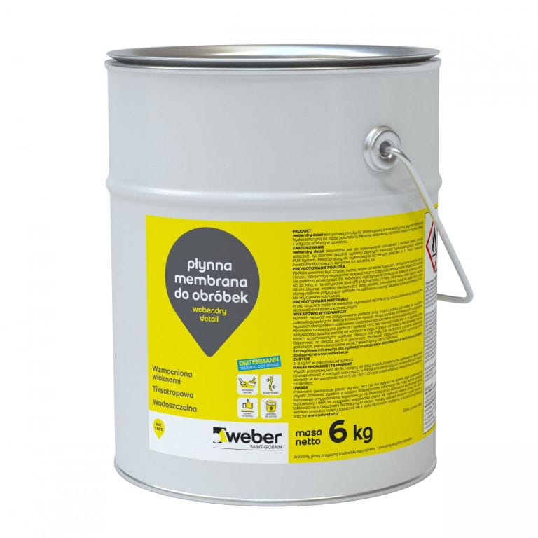 weber.dry detail to płynna, tiksotropowa, trwale elastyczna, wzmocniona włóknami, aplikowana na zimno, jednoskładnikowa membrana poliuretanowa stosowana do obróbek detali w weber.dry PUR System.