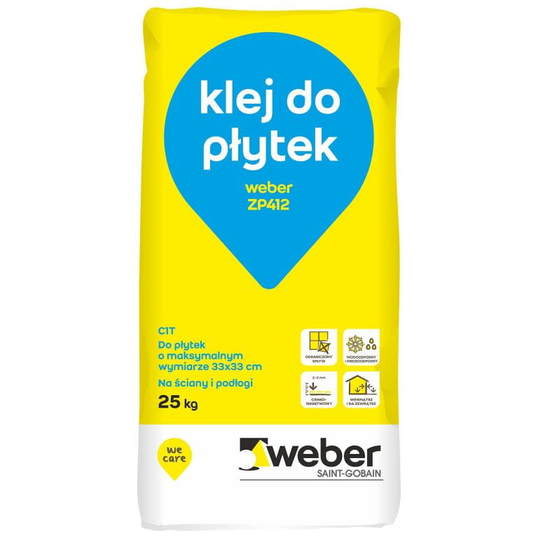 Zaprawa klejąca weber ZP412 może być stosowana wewnątrz i na zewnątrz pomieszczeń w budownictwie mieszkaniowym, np. w kuchniach, łazienkach. Jest ona przeznaczona do układania płytek glazury i terakoty (nasiąkliwość >3%) o rozmiarach do 33,3 x 33,3cm, na ścianach i podłogach.