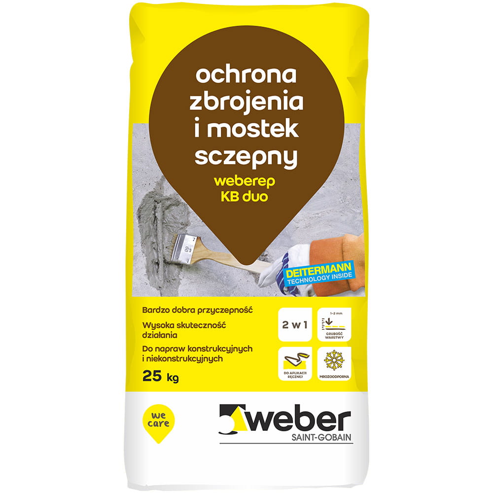 weberep KB duo jest gotową, jednokomponentową, modyfikowaną polimerami mineralną mieszanką, która po zarobieniu wodą tworzy zaprawę przeznaczoną do wykonywania zabezpieczeń antykorozyjnych prętów zbrojeniowych oraz wykonywania warstwy sczepnej w systemach naprawczych PCC, pomiędzy starym a nowym betonem oraz w systemach posadzek mineralnych.