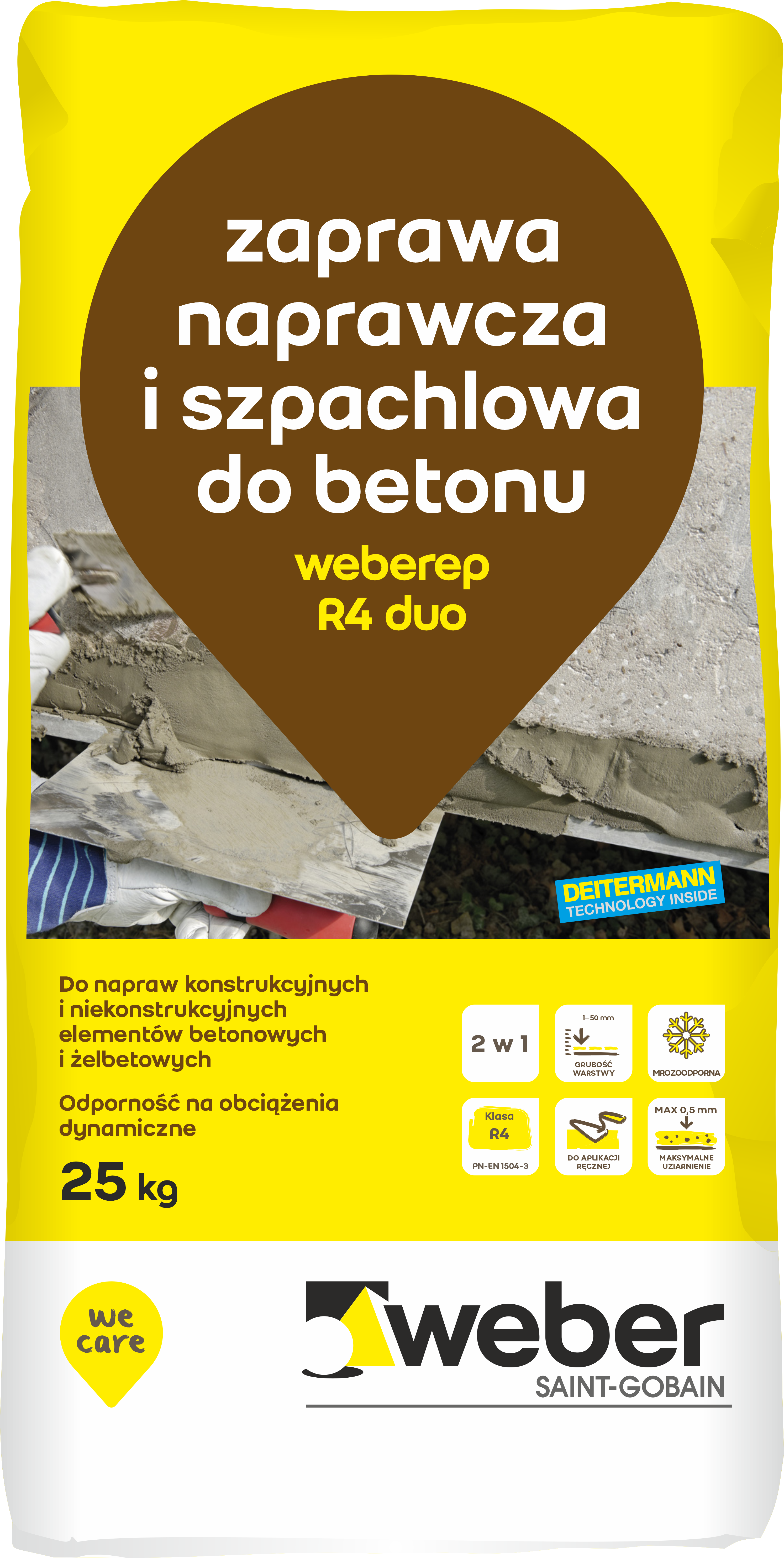 weberep R4 duo to gotowa, sucha mieszanka mineralna modyfikowana polimerami, która po zarobieniu z wodą staje się zaprawą naprawczą PCC przeznaczoną do naprawy i reprofilacji podłoży betonowych i żelbetowych lub wyrównywania i wygładzania powierzchni jako szpachlówka drobnoziarnista. Materiał doskonale sprawdza się jako szpachlówka pod powłoki ochronne oraz systemy posadzek żywicznych. Grubość warstwy od 1 do 50 mm.